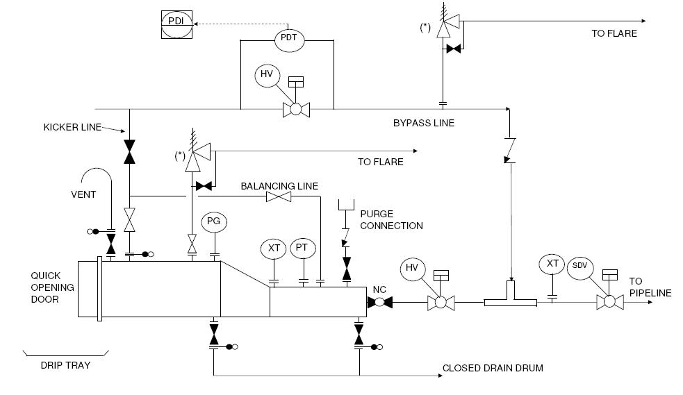 As a safety measure, quick opening door should be mechanically interlocked with isolation valves on kicker line and main line, so that the door cannot be opened when pig trap is still connected to these pressurized lines. This safety precaution can also be accomplished by interlocking the door with vent or depressurizing line, so that the door can be opened only when the pig trap is depressurized.